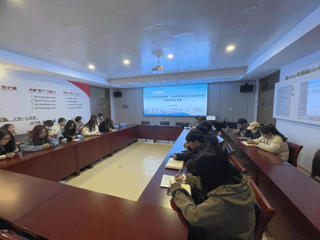 12月8日,商学院学生党支部开展"大力弘扬宪法精神,建设社会主义法治文化"主题党日活动,弘扬了宪法精神,彰显了宪法的最高法律地位。同学们切实感受到了宪法的权威与力量,加深了对宪法的了解与认识,增强了学习贯彻习近平法治思想的行动自觉,让知法、懂法、守法、用法的观念根植师生心田,使尊法、学法、守法、用法在学院蔚然成风,形成尊崇宪法、学习宪法、遵守宪法、维护宪法、运用宪法的良好校园氛围,使人人争做宪法的忠实崇尚者、自觉遵守者、坚定捍卫者。