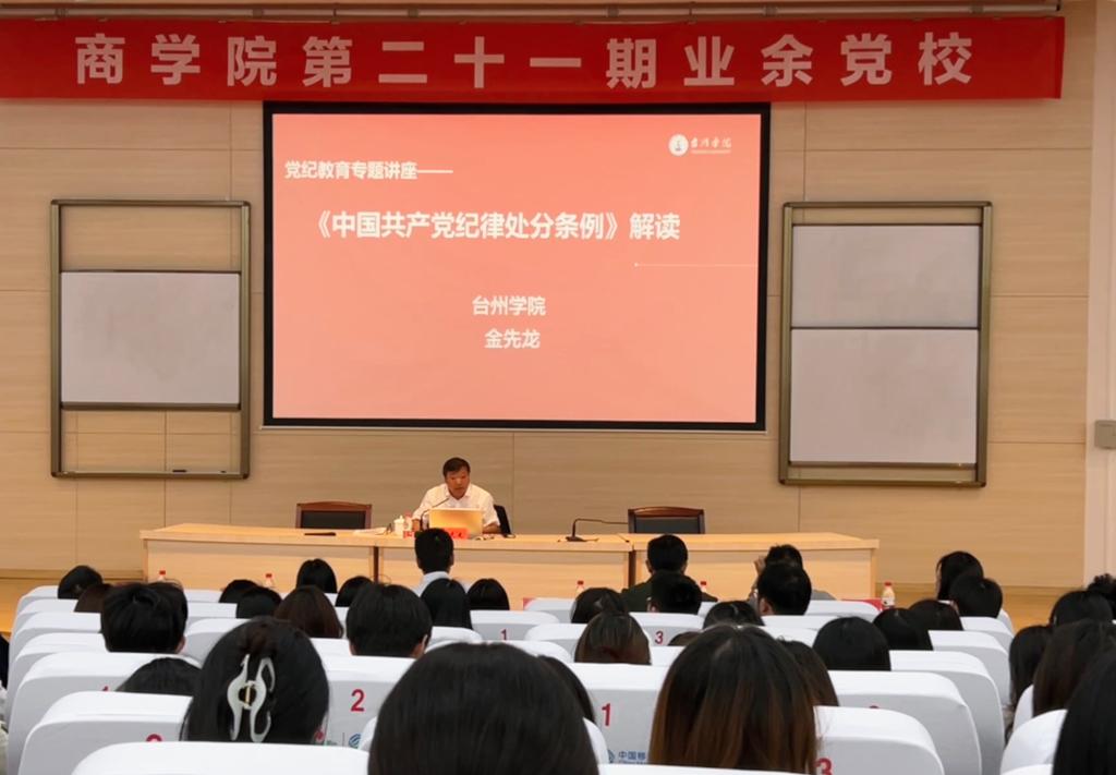 开学典礼后,台州学院原党委副书记金先龙作业余党校第一讲——《中国共产党纪律处分条例》解读。在报告中,金先龙深入解读了《中国共产党纪律处分条例》的修订历程和新增、修改的重点条文。他通过丰富的案例和深刻的分析,让学员们深刻理解了党的纪律教育的重要性和必要性。金先龙强调,党的纪律是党的生命,是全体党员必须遵守的行为准则。他勉励全体学员要认真学纪、准确知纪、自觉明纪、严格守纪,认真学习党的章程,为成为一名合格的中国共产党员而奋斗。
