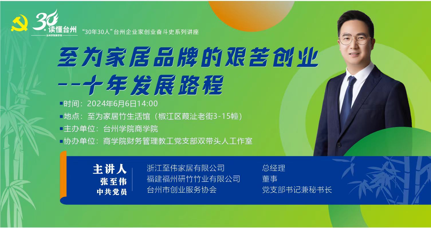 为进一步提炼台州经验,展示台州人民敢闯敢冒、敢为人先的品质,6月6日,商学院邀请优秀校友、浙江至伟家居有限公司总经理张至伟作客“读懂台州”之“30年30人”台州企业家创业奋斗史系列讲座。商学院财务管理教工党支部书记、双带头人工作室耿慧敏教授、组织员吴佳妲和商学院业余党校学员参加。