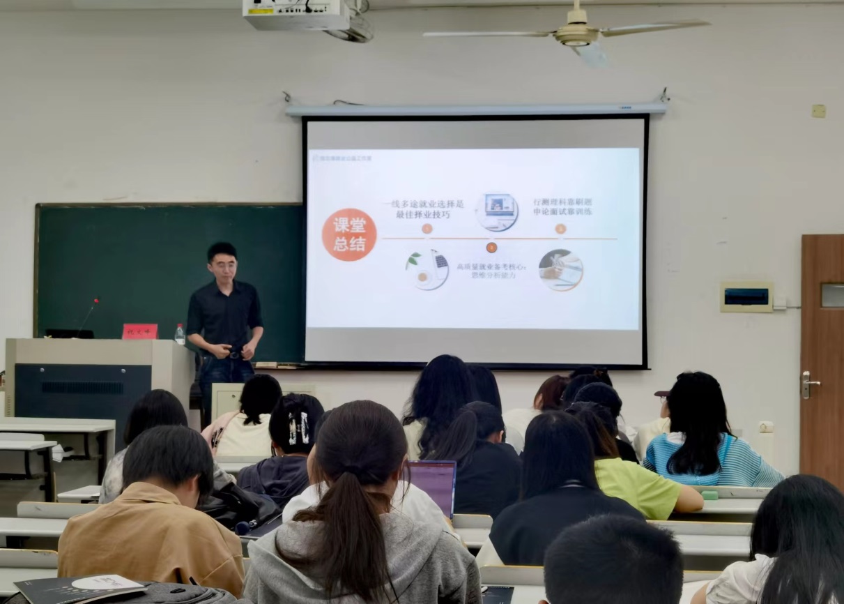 讲座伊始,祝文峰结合近年大学生就业形势及个人经历,介绍了当前公务员招考的岗位需求和薪酬待遇;并结合近年商学院毕业生就业去向的调查数据,比较分析不同行业的优缺点,就“为什么要考公”提出了看法,他认为,编制类考试是学生实现高质量就业的一个选择。随后,祝文峰老师分享了笔试、面试备考技巧,不仅为自学备考的学生整理出一条合理、有规划的任务时间线,还分享了几个行测、申论的网络资源,为不同需求的学生提供了不同的备考建议。在笔试方面,祝文峰强调,思维能力尤为重要,行测考题的深层内核比表象更复杂,考查核心是思维的深度和广度;申论部分则需要更多地阅读《人民日报》等权威刊物的评论,以积累素材和训练思维能力。讲座最后,祝文峰解释了应届生的概念和三方协议的作用,让同学们对其涵义又了更深刻的理解。
