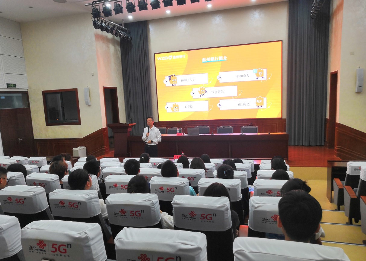 为进一步拓展学生就业渠道,丰富学生的职场认知,10月10日,商学院“职引未来”系列讲座第七讲特邀温州银行台州分行办公室主任陈安一行为学生作“青春有态度,梦想有温度”主题就业指导讲座暨温州银行2024校园招聘宣讲。