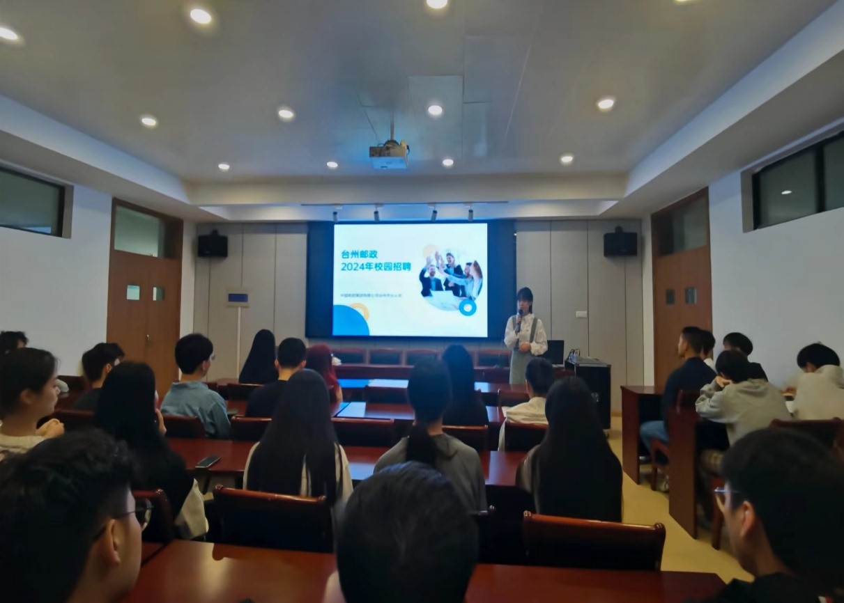 10月26日,中国邮政集团有限公司台州市分公司人力资源部的工作人员王贝妮等受邀走进商学院,为大四同学带来一场内容丰富的校园宣讲。