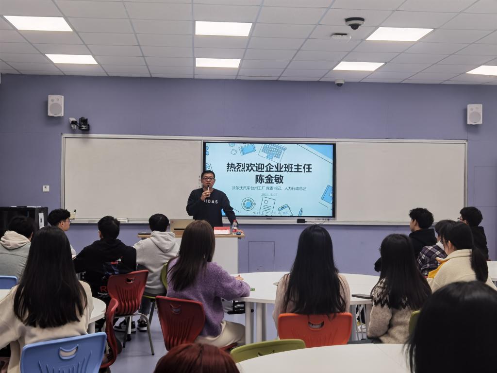 11月15日,商学院23金融学(专升本)企业班主任,沃尔沃汽车台州工厂党委书记、人力行政总监陈金敏,沃尔沃招聘主管崔宁走进校园,倾听学生心声,与学生亲切交流,为同学们带来一节生动的职规课。商学院党委副书记陈斌岚、23金融学(专升本)班主任庞杰、商学院就业辅导员赵之遐、23金融学(专升本)全体同学参加活动。