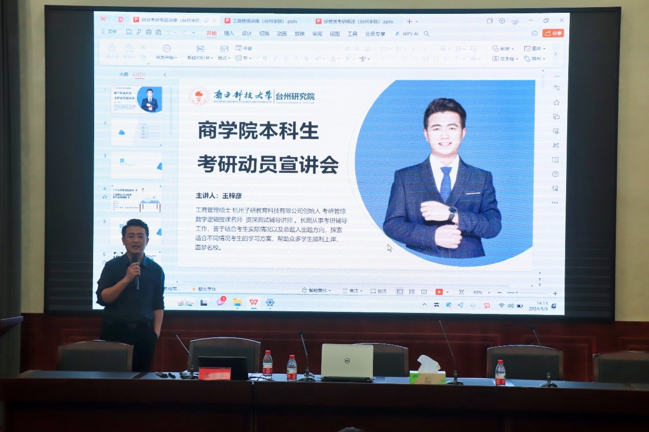 为激发学生对提升学历的热情,增加对考研的理解,以提前做好个人规划,5月9日下午,在商学院大楼506召开了考研动员分享会。本次会议特邀南方科技大学及台州研究院的王梓彦老师进行专题讲座,会议由商学院副院长陈国栋主持,相关师生代表参加会议。