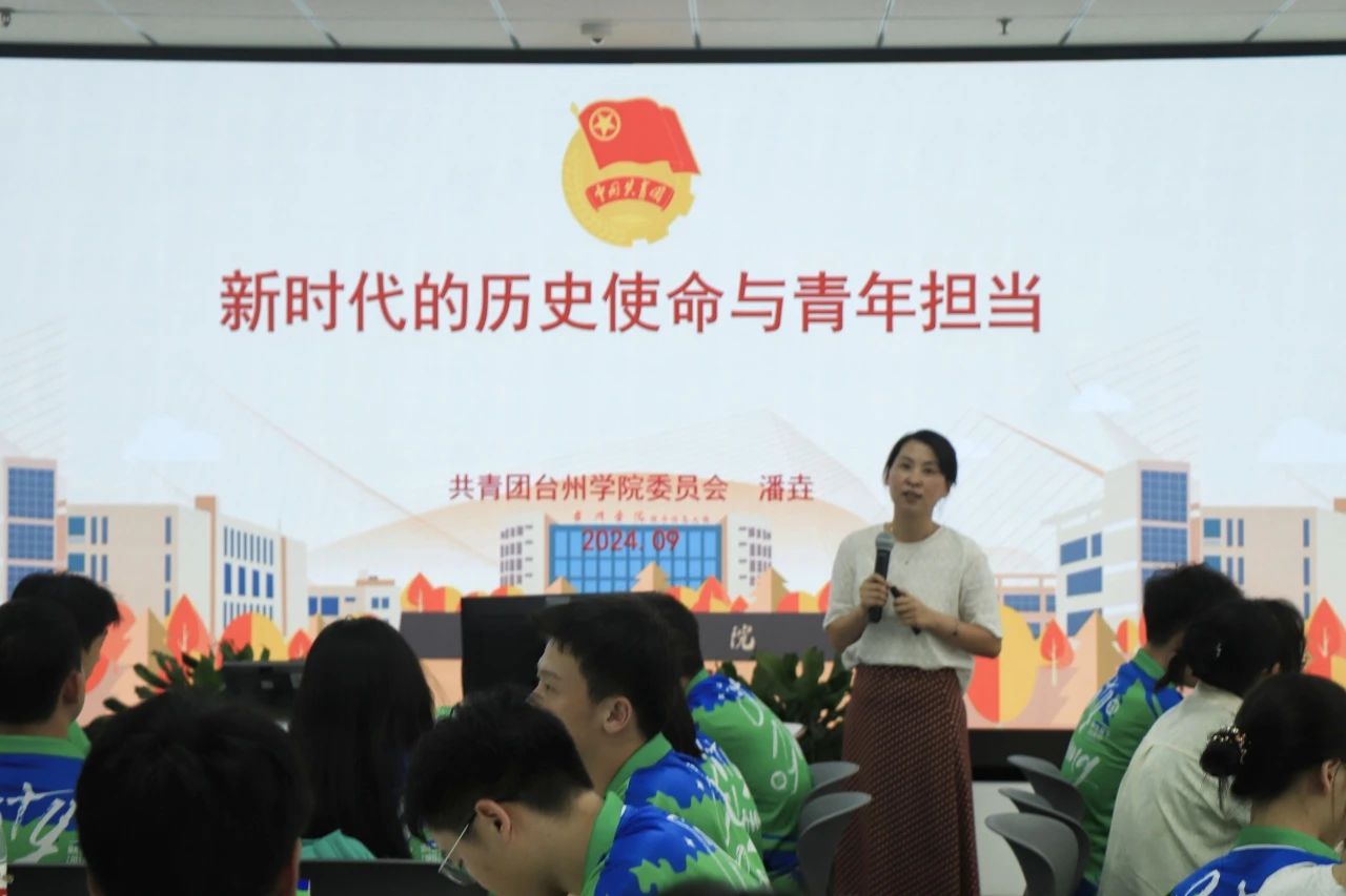 台州学院团委书记潘垚为同学们做新时代的历史使命与青年担当的专题讲座,她从新时代青年学生的网络素养和新时代青年学生干部的责任与担当两个方面对同学们进行培训,希望同学们在未来的工作和生活中能够做到有理想、敢担当、能吃苦、肯奋斗,不断提高政治站位,牢记服务宗旨,勉励同学们都能成为社会主义合格的建设者。