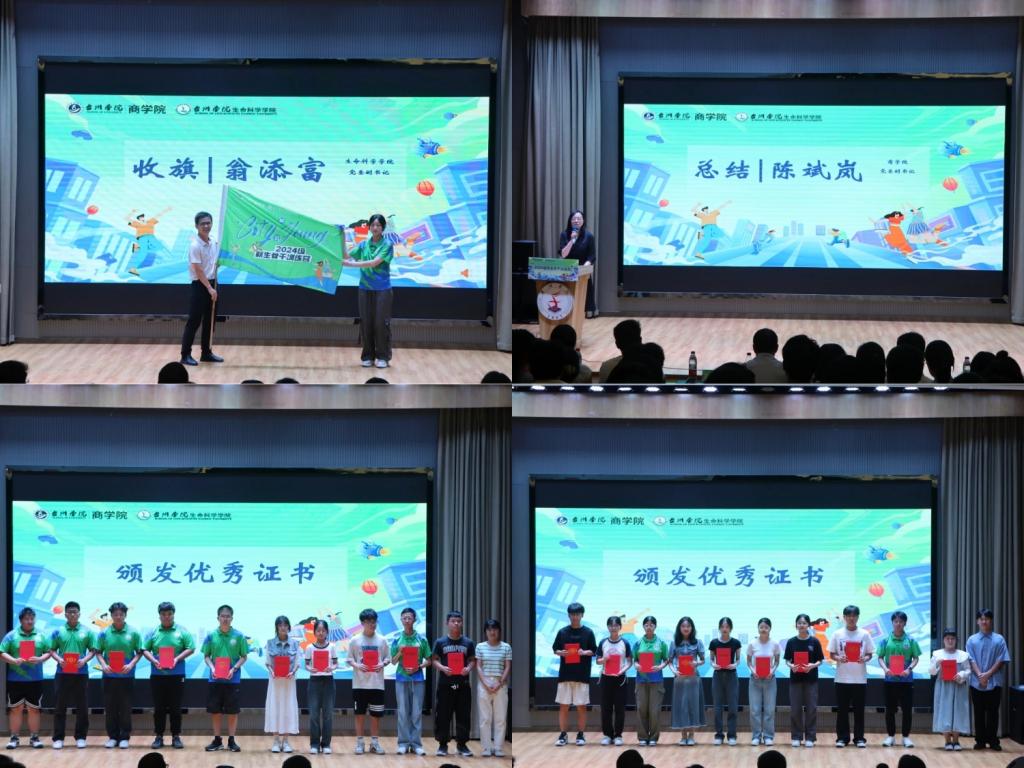 新生骨干训练营结业典礼和新老生联欢会在大学生活动中心3207举行,商学院党委书记马斌、生命科学学院党委书记郑晓莉、商学院党委副书记陈斌岚、生命科学学院党委副书记翁添富以及两个学院的辅导员参加活动。会上,同学们首先观看了这几天活动的视频集锦,回顾了过去训练营几天的点点滴滴;接着24科学教育2班的周杰同学进行发言,他表示这几天训练营的活动让自己收获满满,也感谢老师们的这几天的辛勤付出,未来自己会更加努力;商学院学工办主任李金花为学员颁发结业证书,商学院辅导员项民、生命科学学院辅导员李莎莎为学员颁发优秀证书;随后,翁添富向新生骨干训练营的同学举行收旗仪式,标志骨干训练营将会薪火相传、越来越好。最后,陈斌岚总结讲话,她表示,这次结营并不是结束,而是新的开始,并对同学们提出三个期望:一是要树立一个为同学们服务的目标,二是要拥有团结合作、担当奉献的两个品质,三是要尝试加入一个学生组织、参加一次学科竞赛、发展一项兴趣爱好,让自己在青春的赛道上跑出自我的风采。最后,老师和同学们一起观看新老生联欢会。