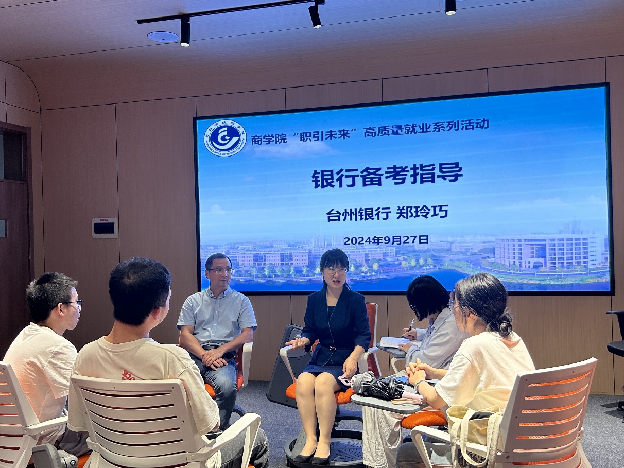 为扎实推进毕业生就业工作,提高学生在银行业求职中的竞争力,9月23日至27日,商学院邀请泰隆银行、建设银行、台州银行招聘负责人走进校园,和同学面对面交流银行备考事宜。商学院党委书记马斌出席活动。商学院就业辅导员赵之遐,各专业应届毕业生参加活动。