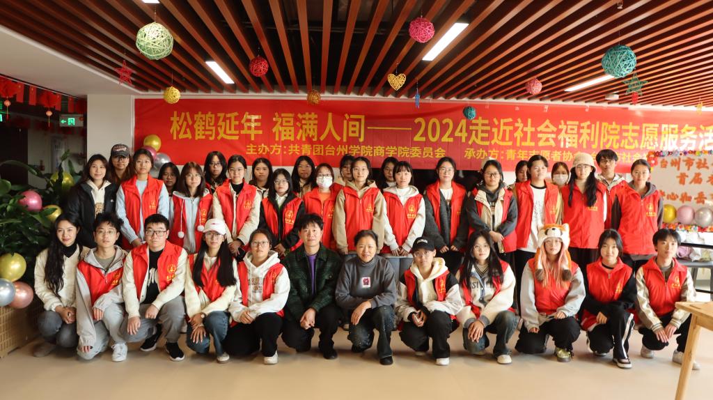 为赓续“尊年尚齿,德润桑榆”的善德义行,11月30日,台州学院商学院青年志愿者协会协同台州市社会福利院举办了“松鹤延年,福满人间”——2024走进社会福利院志愿服务活动。此次活动共组织约40名学生志愿者前往台州市社会福利院,并捐赠30余本书籍给台州市社会福利院。