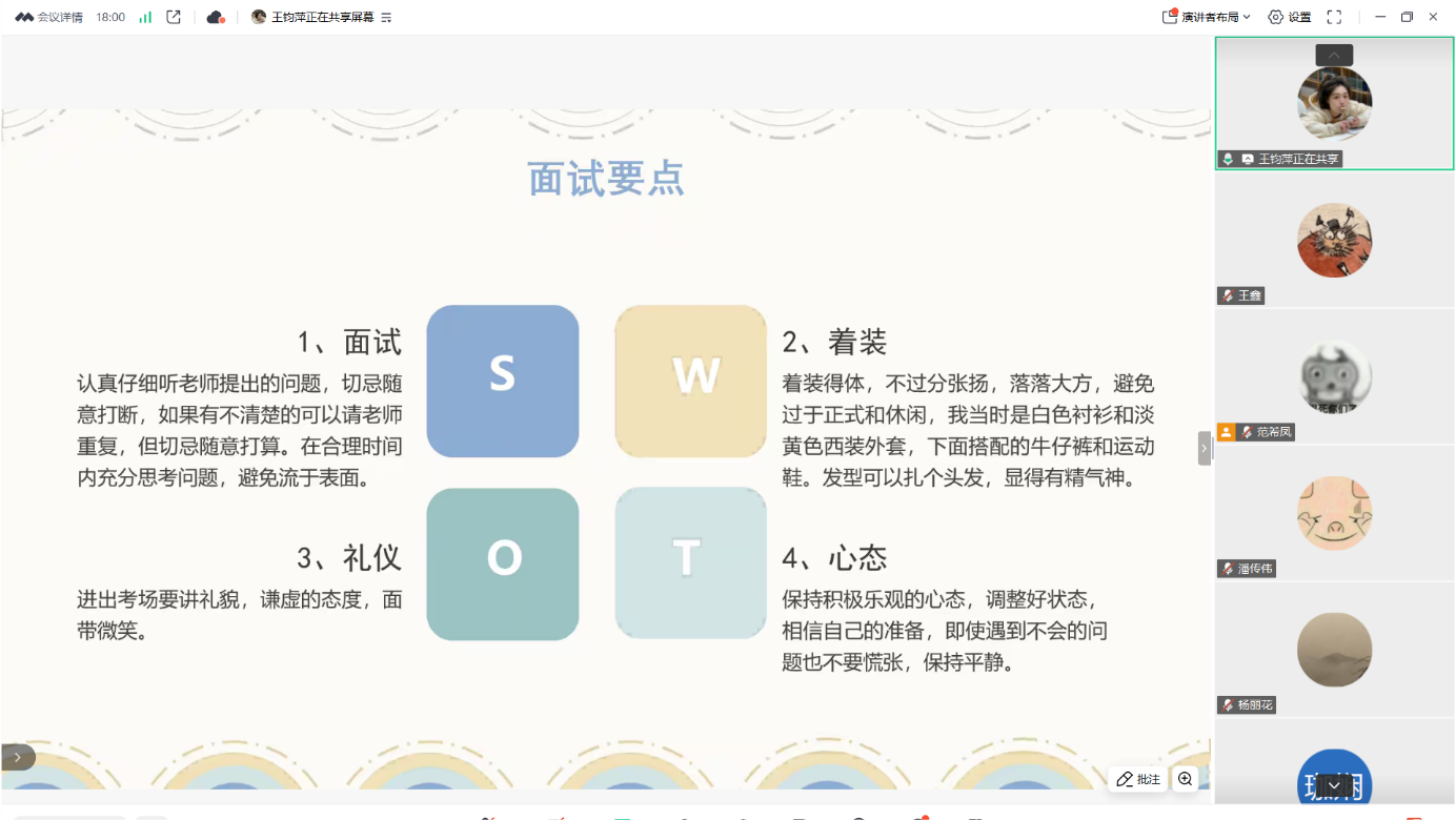 活动开场,刘璇学姐以自身经验为切入点,指出心态与细节是复试成功的关键因素。备考时积极自我暗示;面试前模拟突发情况,面试时用小缺点拉近距离,注重逻辑表达和眼神交流;备考把中英文自我介绍和导师课题结合,关注学术前沿。王钧萍建议用 SWOT 分析法进行复试准备;英语面试注重流畅,可录音自查,熟悉高频问题关键词;专业课遇到难题灵活迁移知识;着装得体,注意考场礼仪。潘传伟指出精准备考关键在于联系直系学长学姐了解考察重点;英文自我介绍精简真实,突出关键信息。郑熙强调简历用 STAR 法则描述经历,清晰展现情境、任务、行动及成果,避免简单罗列奖项;提醒大家复试前规律作息,保护备考隐私。