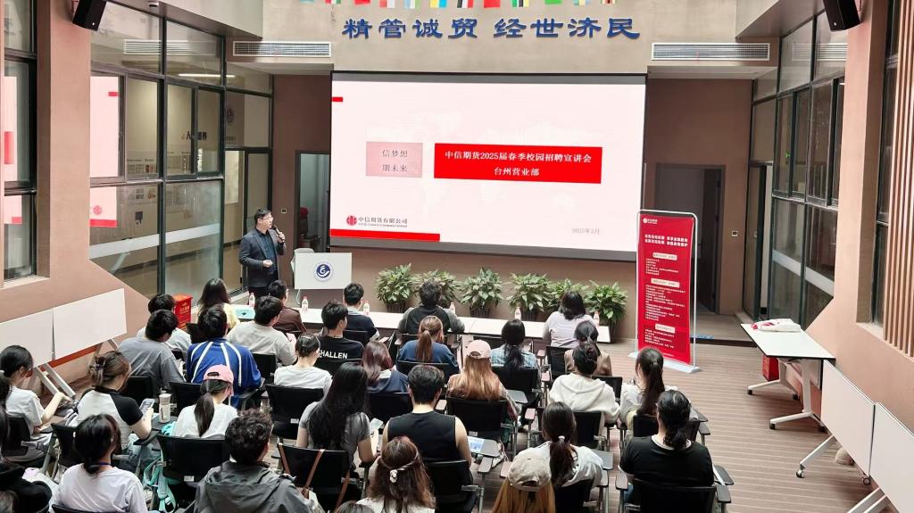 为丰富学生对期货行业的认知,增加学生的就业机会,3月27日,商学院联合校就业服务协会,特邀中信期货台州营业部负责人郑亮走进校园,在商学院一楼中厅举办“职引未来”高质量就业活动第三十期:中信期货2025届春季校园招聘宣讲会,50多位学生到场参加。