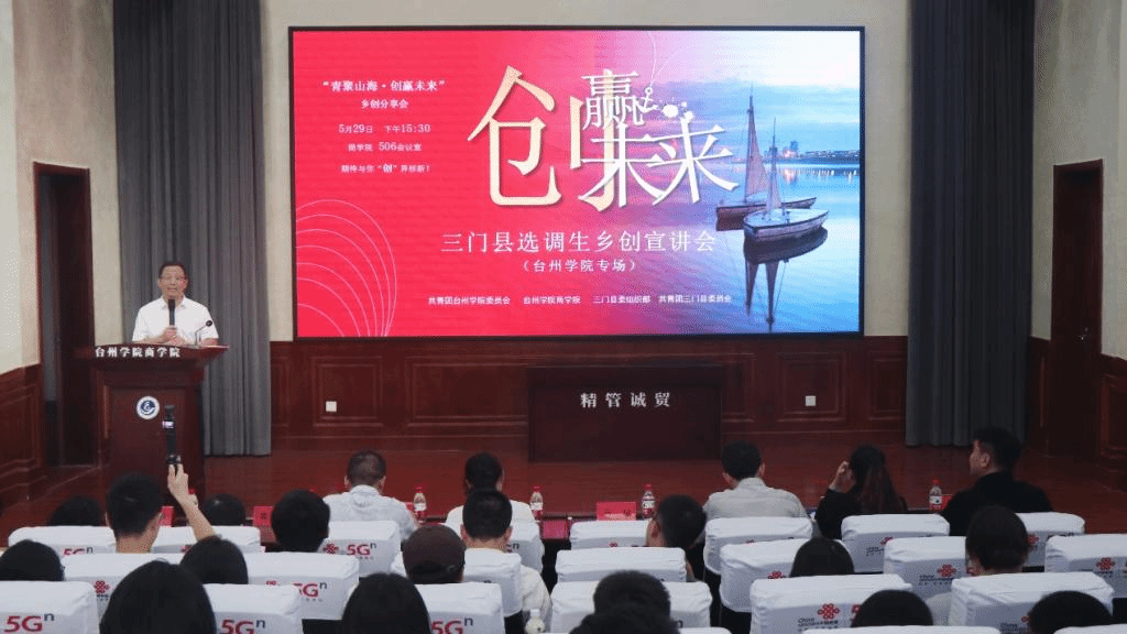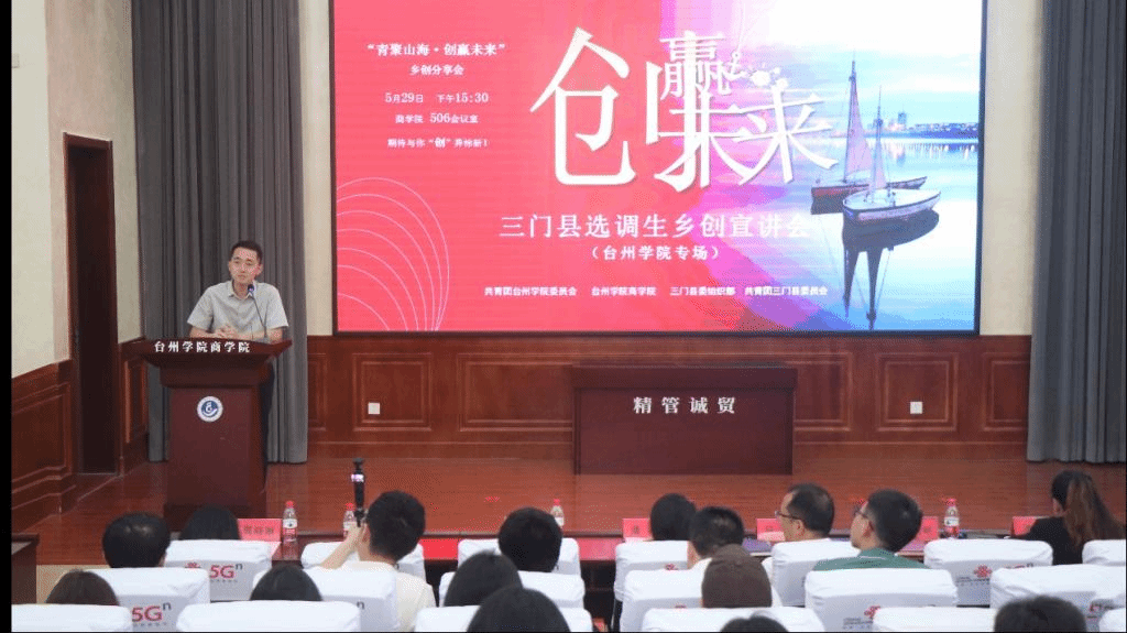 5月29日,商学院506报告厅气氛热烈,“青聚山海·创赢未来”三门县选调生乡创宣讲活动在此隆重举行。本次活动由共青团台州学院委员会、台州学院商学院联合三门县委组织部、共青团三门县委员会共同主办,由商学院龙潭书院与三门县选调生“星耀班”联合承办,旨在响应国家乡村振兴战略,搭建青年人才返乡创业交流平台,深度融合地方乡创资源与学院学科优势。共青团台州学院委员会书记潘垚,商学院党委书记马斌,共青团三门县委书记陈威屹,三门县委人才办专职副主任、干部科科长柯名群等嘉宾应邀出席活动。