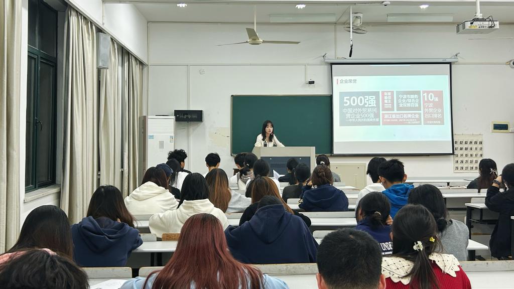 10月23日,商学院“职引未来”高质量就业活动第五十三期在4-207教室举行,宁波亚虎进出口有限公司招聘经理徐梦婷,业务总监郑定伟受邀开展校园招聘宣讲。本次活动吸引了80余位同学到场参加,现场气氛热烈。