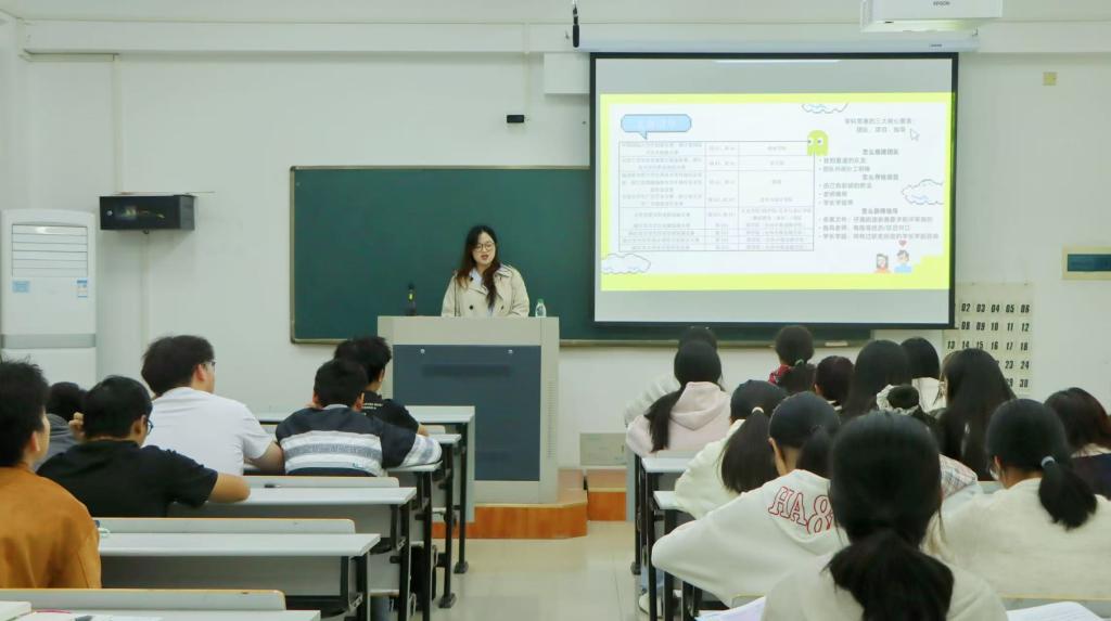 活动伊始,李晓萱强调了自律学习这一主线任务的重要性,给出应选择适宜的学习环境、合理设定学习任务、有效隔离干扰因素等一系列建议。随后,针对竞赛这一同样不可忽视的支线任务,她指出三个关键要素,分别是团队建设、项目准备和专业指导,并且对每一步做出细化与解释。接着,有关学生工作这一支线,李晓萱提出“始于热情,终于责任;公平公正,以身作则;持平常心,拥抱挫折”的二十四字心得,引导同学们认识到成为一名优秀的学生干部,应当将每一次工作落细做实,坚守自己的初心。最后是实践活动支线,她倡议同学们大学期间要主动参与社会实践和志愿者活动,积极利用学校提供的各类资源,如企业班主任制度、HR导师资源等,积极拓展自身视野,重视学与用的结合,不断提升就业实践能力。此外,李晓萱还就大学的评奖评优细则、体测要求等事项进行补充说明。并寄语同学们要避免随波逐流,学会调节压力,在大学生活中活出自己的精彩。