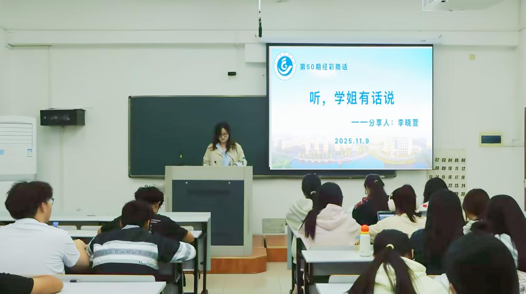 11月9日晚,商学院于教学楼5-402教室举办第五十期经彩商话活动。由优秀学姐代表22工商管理专业李晓萱同学担任主讲嘉宾,25工商管理班和其他专业学生代表参与。围绕“一个主线、三个支线”的框架,李晓萱系统分享了大学生活的规划与行动建议。
