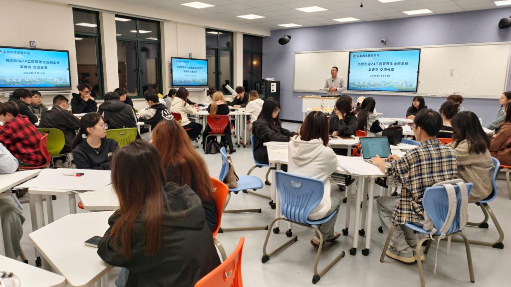 为进一步推进校企协同育人,精准对接企业人才需求,11月13日晚,商学院在6-204开展24工商管理企业班主任见面会。本期活动特邀台州HR导师团导师、天宇药业总裁助理吴春亮先生进校园,围绕“从学业择业就业,到敬业乐业事业”主题与24工商管理专业学生展开交流。