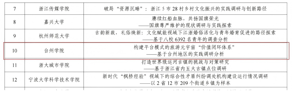 近日,由中共浙江省委宣传部、浙江省教育厅、共青团浙江省委、浙江省学生联合会开展的高校暑期社会实践典型案例征集活动公布结果。全省共择优确定典型案例120项,商学院“元宇宙文旅融合”实践队凭借项目《构建平台模式的旅游元宇宙“价值闭环体系”——基于台州地区的实践调研分析》成果入选省高校暑期社会实践典型案例,展现了商学院学子在数字化转型与文旅创新领域的探索成果。