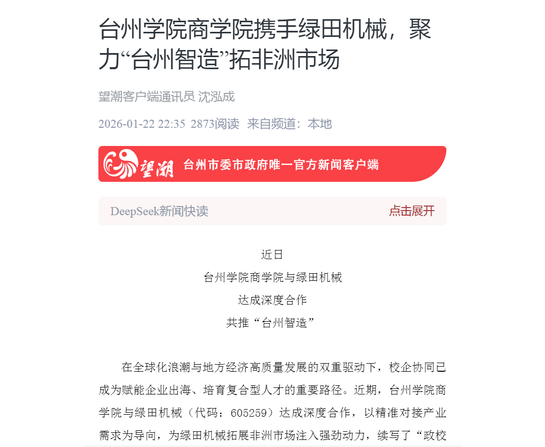 在全球化浪潮与地方经济高质量发展的双重驱动下,校企协同已成为赋能企业出海、培育复合型人才的重要路径。近期,台州学院商学院与绿田机械(代码:605259)达成深度合作,以精准对接产业需求为导向,为绿田机械拓展非洲市场注入强劲动力,续写了“政校企”协同育人、服务产业的新篇章。