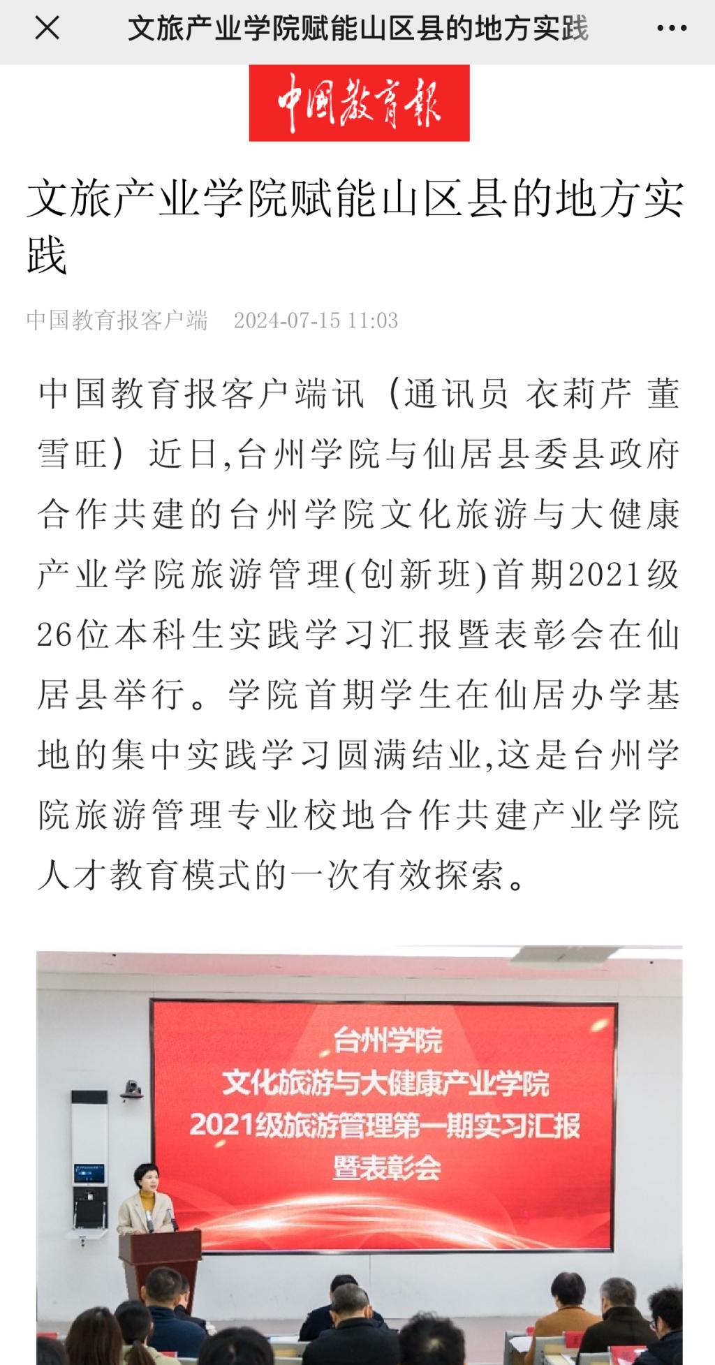 近日,台州学院与仙居县委县政府合作共建的台州学院文化旅游与大健康产业学院旅游管理(创新班)首期2021级26位本科生实践学习汇报暨表彰会在仙居县举行。学院首期学生在仙居办学基地的集中实践学习圆满结业,这是台州学院旅游管理专业校地合作共建产业学院人才教育模式的一次有效探索。