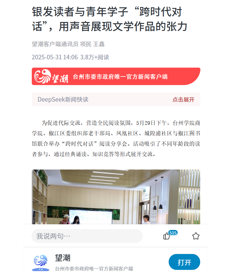 此次活动有效搭建了代际沟通的桥梁,丰富了全民阅读的内涵。本次分享会虽已结束,但阅读的故事还在继续,“跨时代对话”共读计划持续展开,将持续探索多元阅读推广模式,为“文化椒江”建设贡献力量。