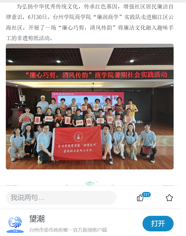 为弘扬中华优秀传统文化,传承红色基因,增强社区居民廉洁自律意识,6月30日,台州学院商学院“廉润商学”实践队走进椒江区云海社区,开展了一场“廉心巧剪,清风传韵”将廉洁文化融入趣味手工的非遗剪纸活动。