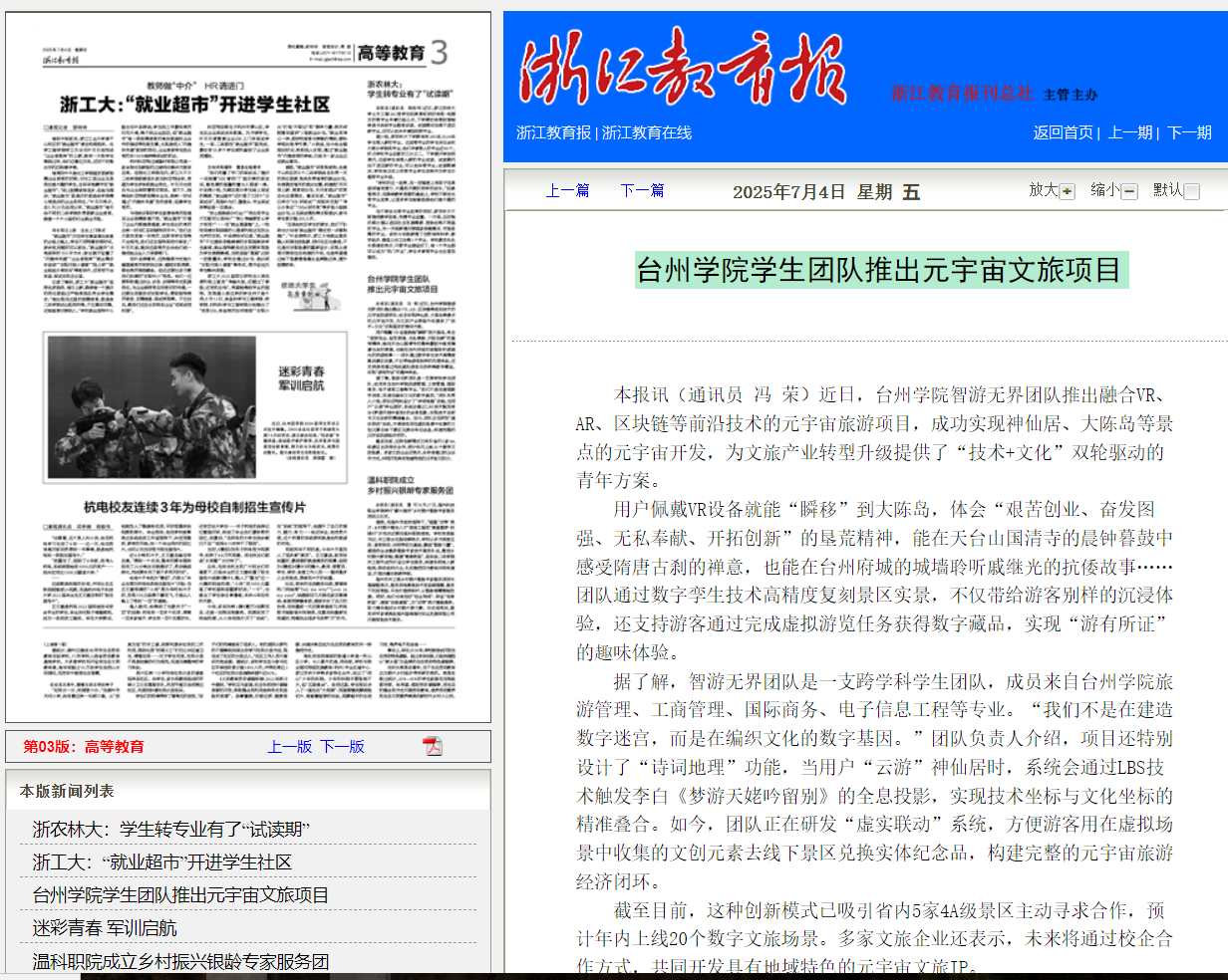 据了解,智游无界团队是一支跨学科学生团队,成员来自台州学院旅游管理、工商管理、国际商务、电子信息工程等专业。“我们不是在建造数字迷宫,而是在编织文化的数字基因。”团队负责人介绍,项目还特别设计了“诗词地理”功能,当用户“云游”神仙居时,系统会通过LBS技术触发李白《梦游天姥吟留别》的全息投影,实现技术坐标与文化坐标的精准叠合。如今,团队正在研发“虚实联动”系统,方便游客用在虚拟场景中收集的文创元素去线下景区兑换实体纪念品,构建完整的元宇宙旅游经济闭环。