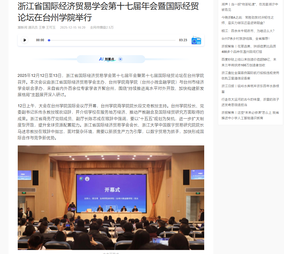 2025年12月12日至13日,浙江省国际经济贸易学会第十七届年会暨第十七届国际经贸论坛在台州学院召开。本次会议由浙江省国际经济贸易学会主办,台州学院商学院(台州小微金融学院)与台州市经济学会联合承办,来自省内外百余位专家学者齐聚台州,围绕“持续推进高水平对外开放、加快构建新发展格局”主题展开深入研讨。